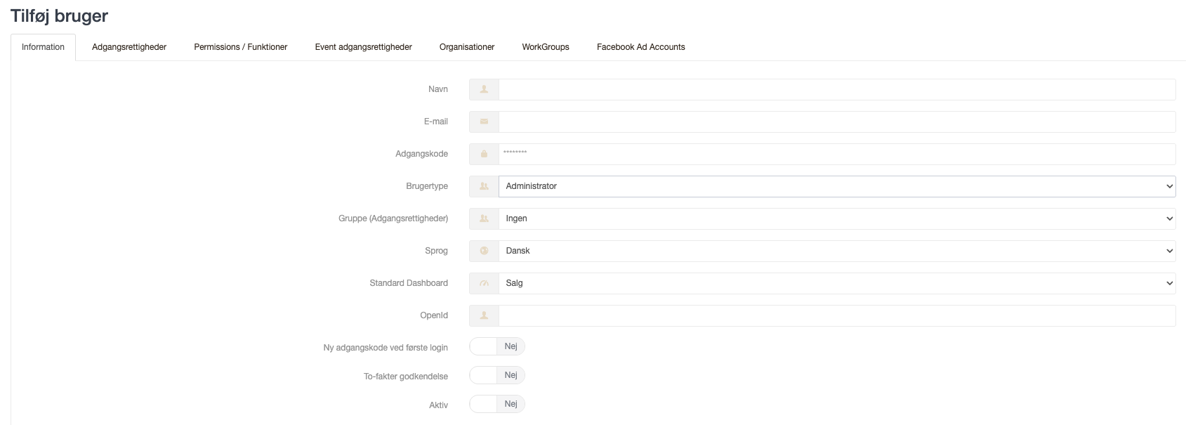 Det er ikke muligt at tilføje en ny bruger, som man sædvanligvis gør. Dog er det stadig muligt at tilføje brugeren som en ekstern bruger under fanen adgangsrettigheder for de events, som brugeren skal have adgang til.