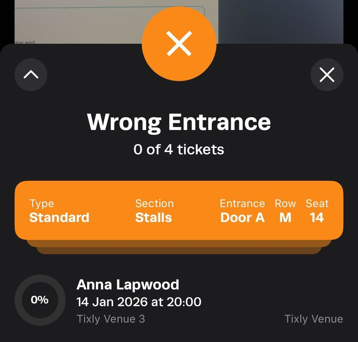 On customer tags, allocations and ticket types scan notifications can be configured in Box Office. When a ticket with a scan notification is scanned, the configured message will show up at the top of the screen.