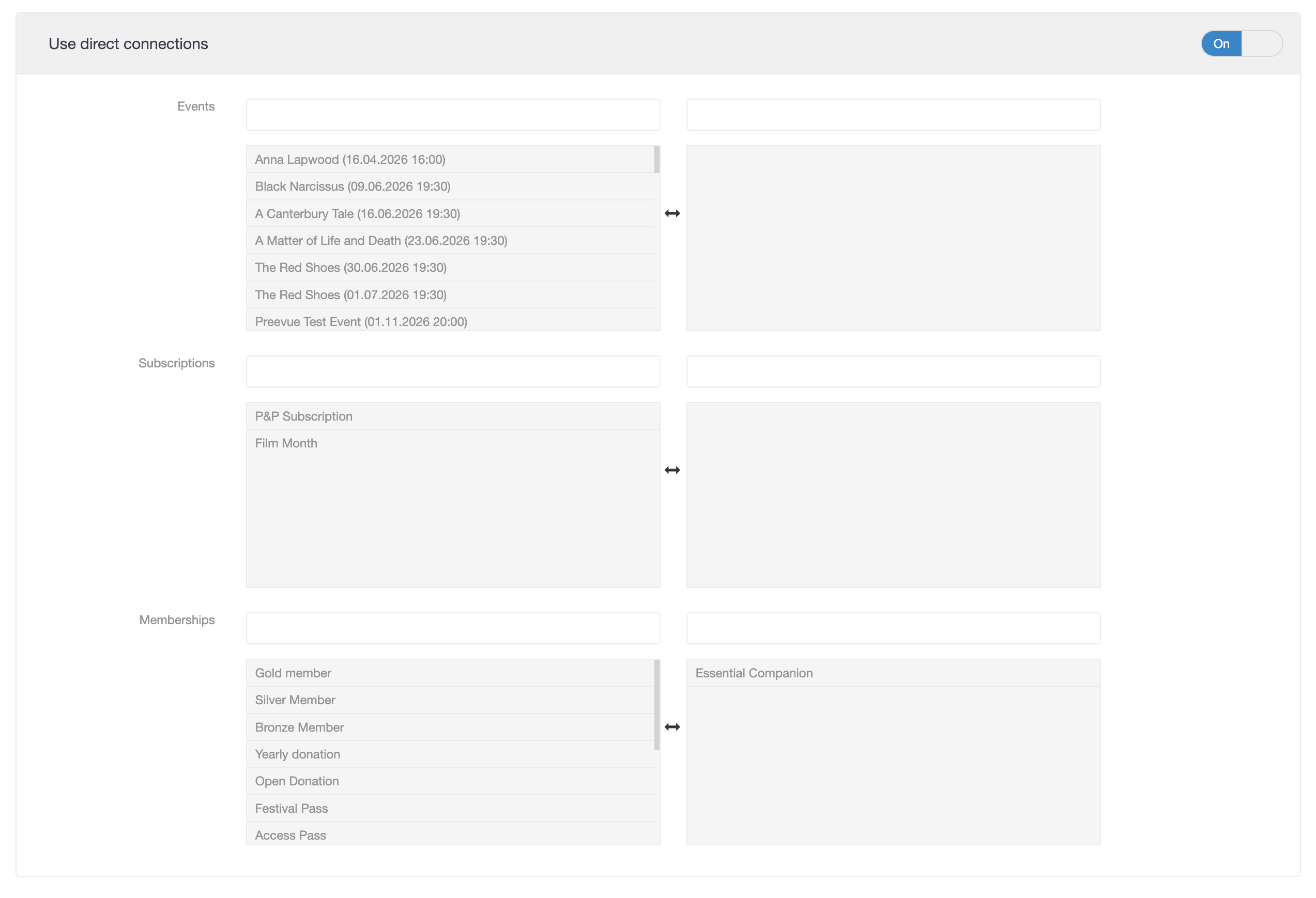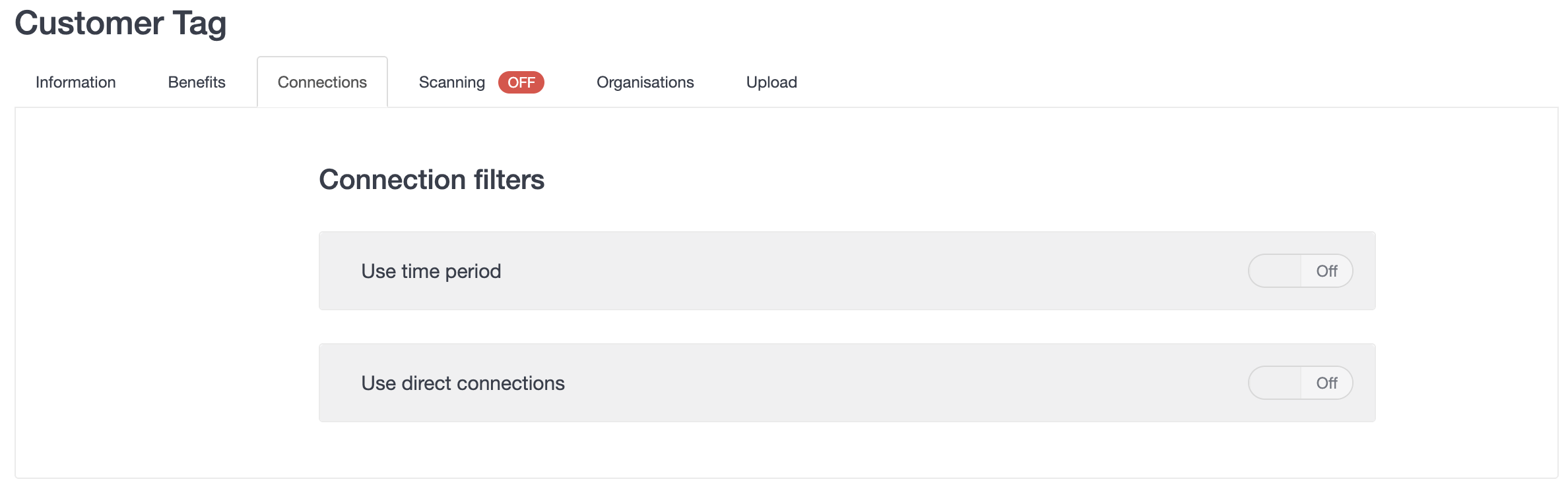 The Connections tab allows for automated customer tagging triggered by the purchase of specific events, memberships, and subscriptions, or based on general purchase behaviour.