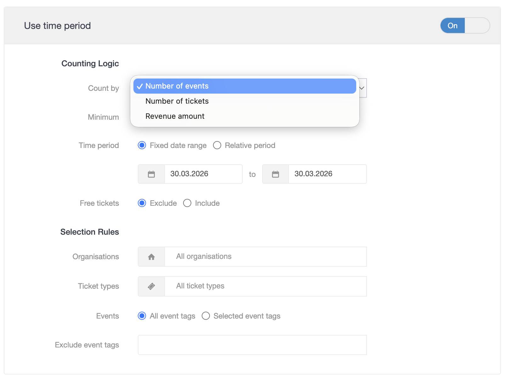 Use Time Period Tagging to automatically tag customers based on their purchase behaviour. Whether it’s a specific number of events, total tickets, or a minimum spend. Further refine these rules by including only specific organisations and ticket types or by excluding certain events.