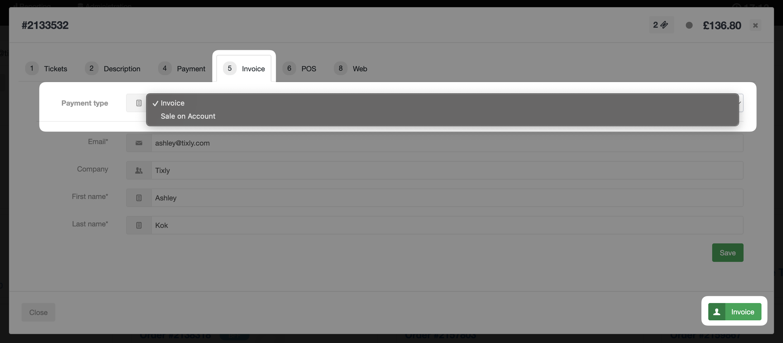Tixly's Box Office system offers two options for processing orders on invoice: Invoice and Sale on Account. These options are designed to support different workflows for invoicing, ticket delivery, and payment handling.