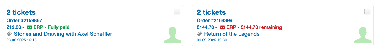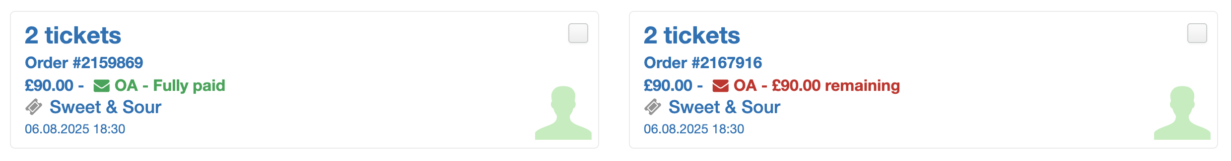 Tickets cannot be downloaded from the Online Receipt Page until a Sale on Account order has been fully settled. In addition, orders cannot be merged, and seats cannot be moved to new seats or events until payment has been completed.