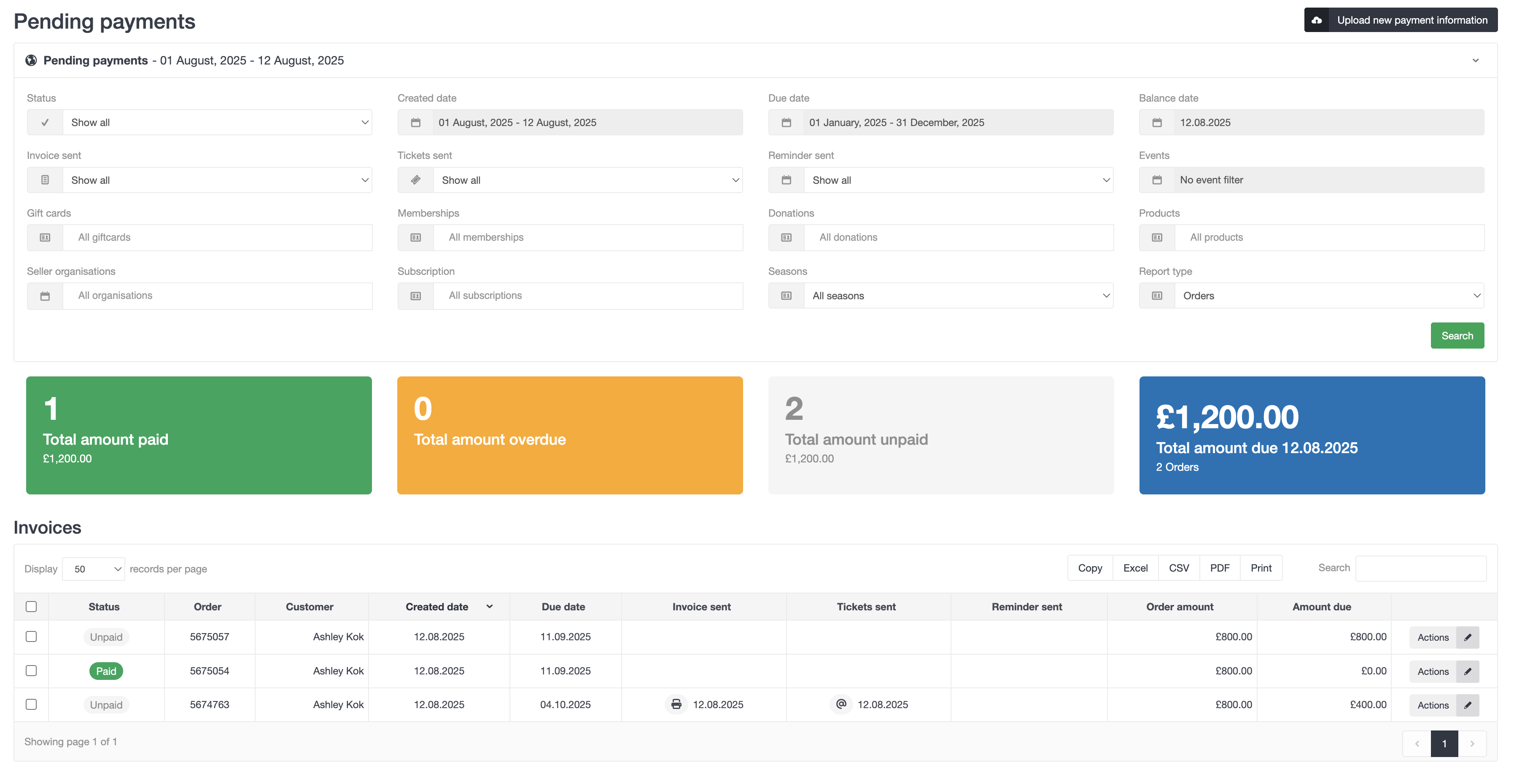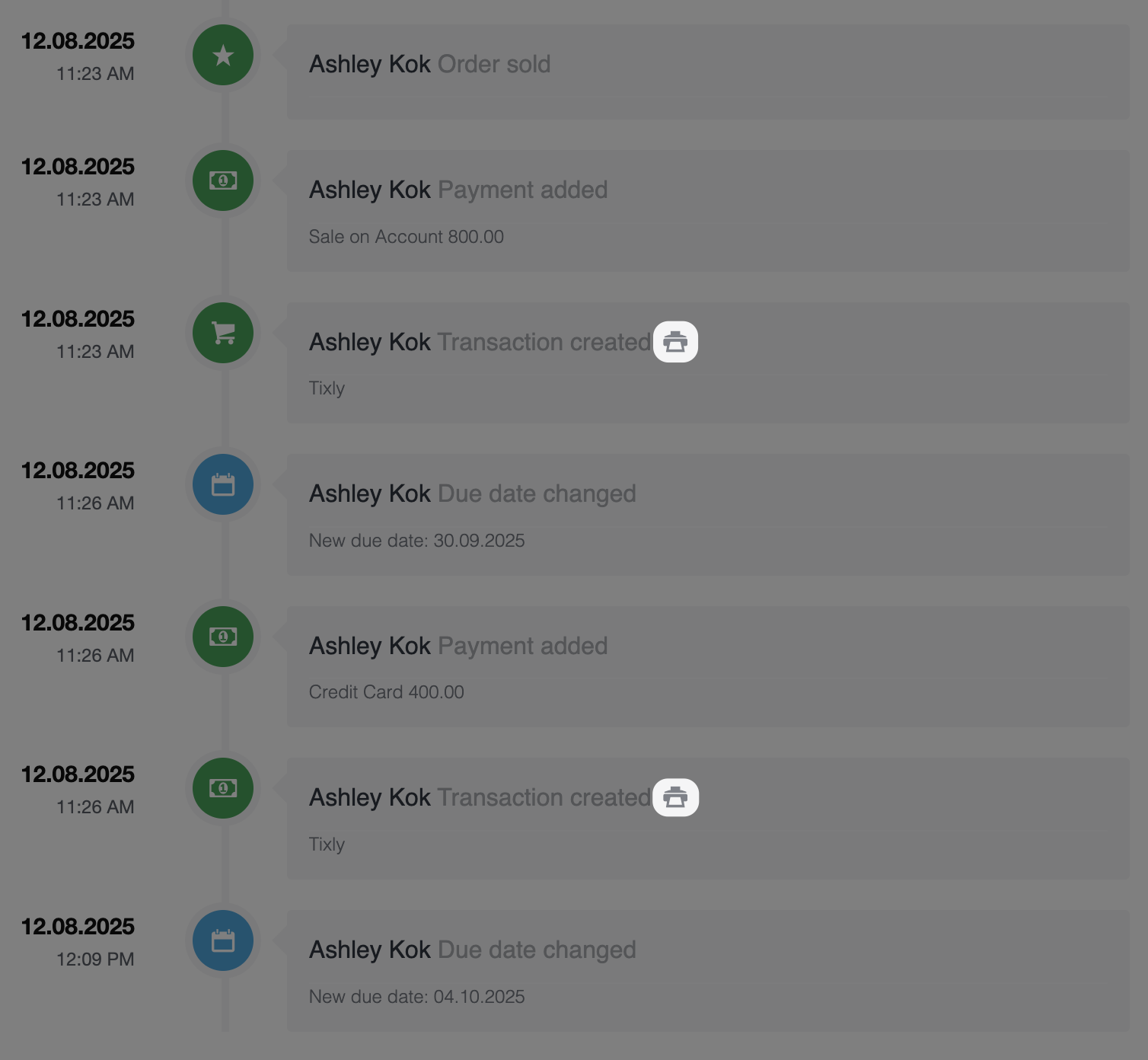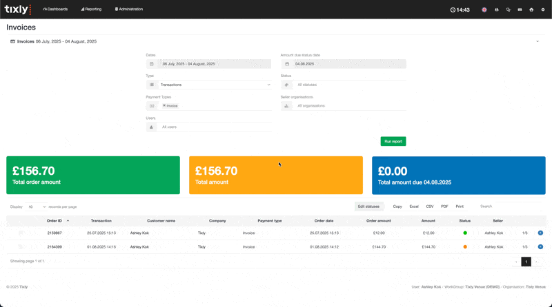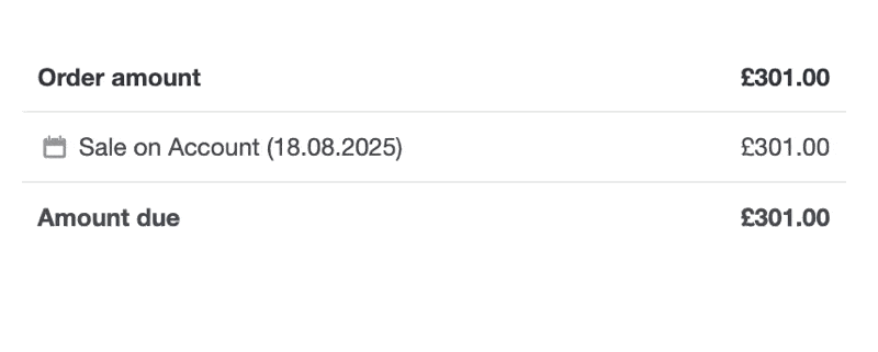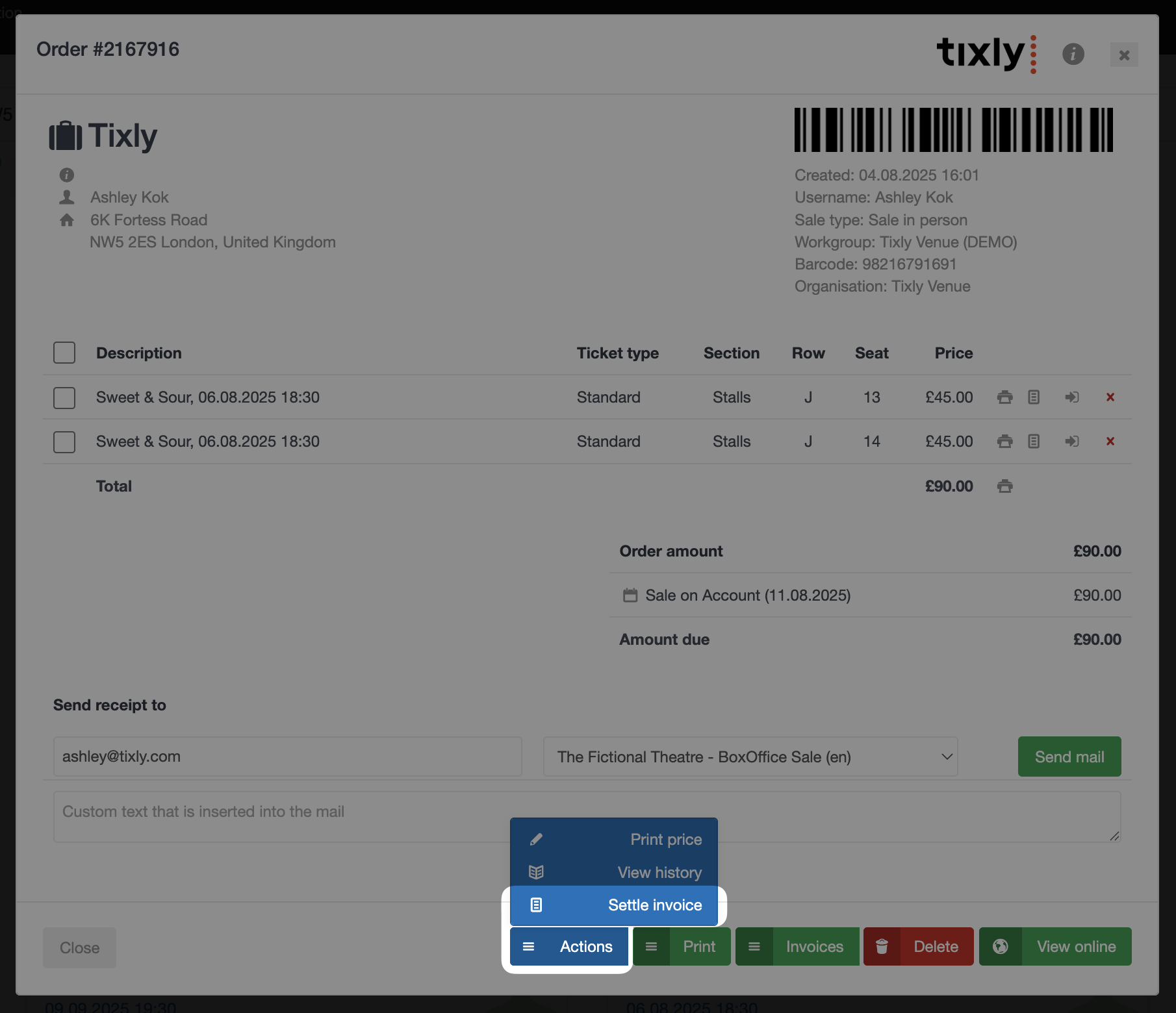 - Sale on Account is a more structured option that includes invoice generation within Tixly. A due date is applied to the order, and the invoice (and reminders) can be sent directly via email. Tickets are released only after the invoice is paid. This method supports multiple payment types, editable due dates, and partial payment balance tracking from the customer card. Orders under this method cannot be merged, and seats cannot be changed until payment has been received.