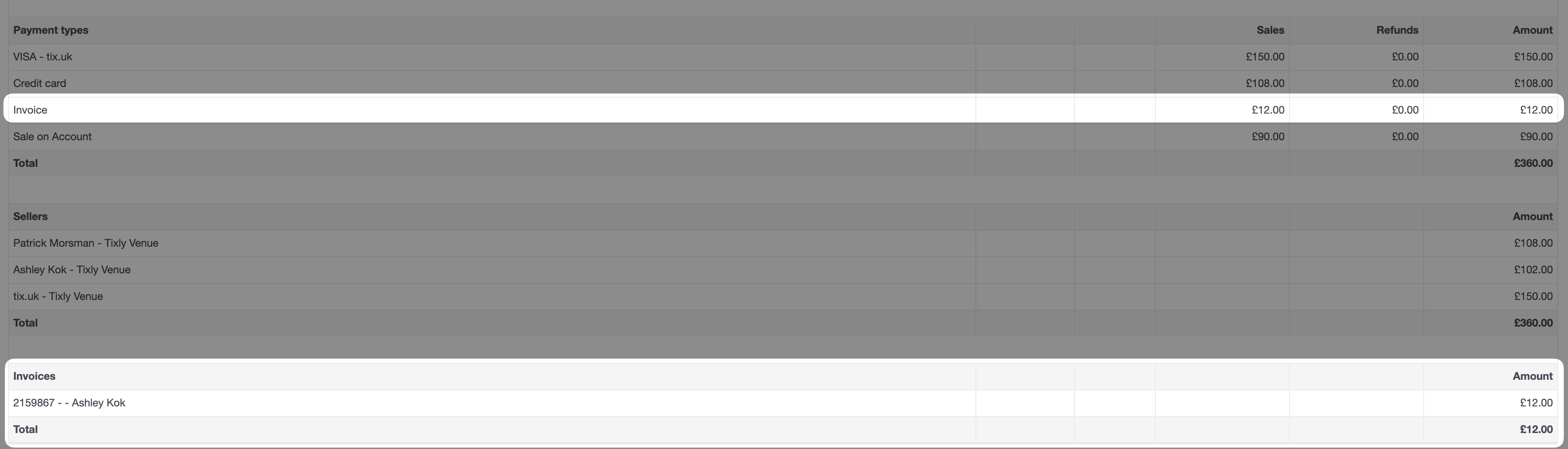 In the Cashier Report, the invoice payment type is shown on a separate row under the payment types section. In addition to that all invoice payments are also shown in a dedicated section. This structure is used to ensure that all invoice payments are clearly identified, helping the finance team determine which invoices must be created by the end of the day.
