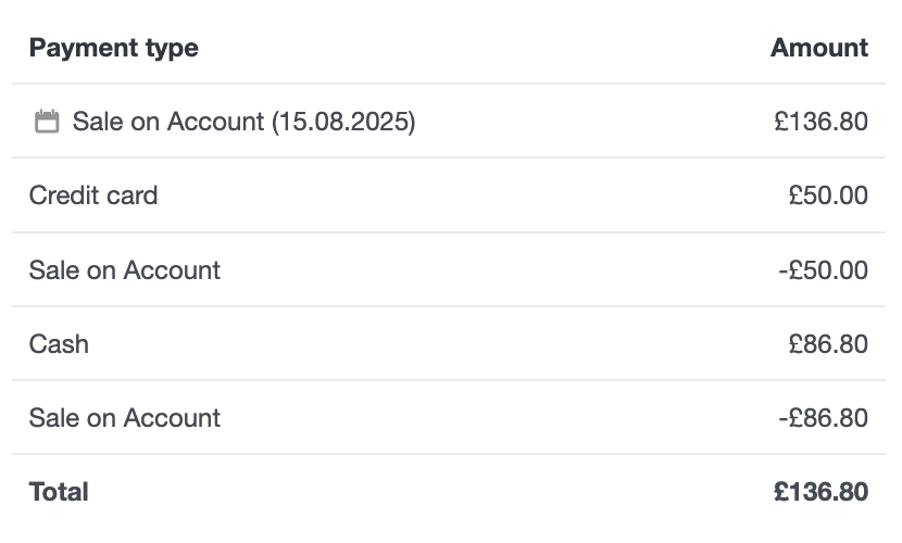 A full or partial payment can be added using the Payment or POS tab. Select the amount and payment type, then click the Add Payment button. This will either add the partial payment to the order or will sell the full order. Unlike the Invoice option, the Sale on Account will register the actual payment type. As you can see in the example below, Sale on Account is a temporary payment type that is refunded and sold as the actual payment type.