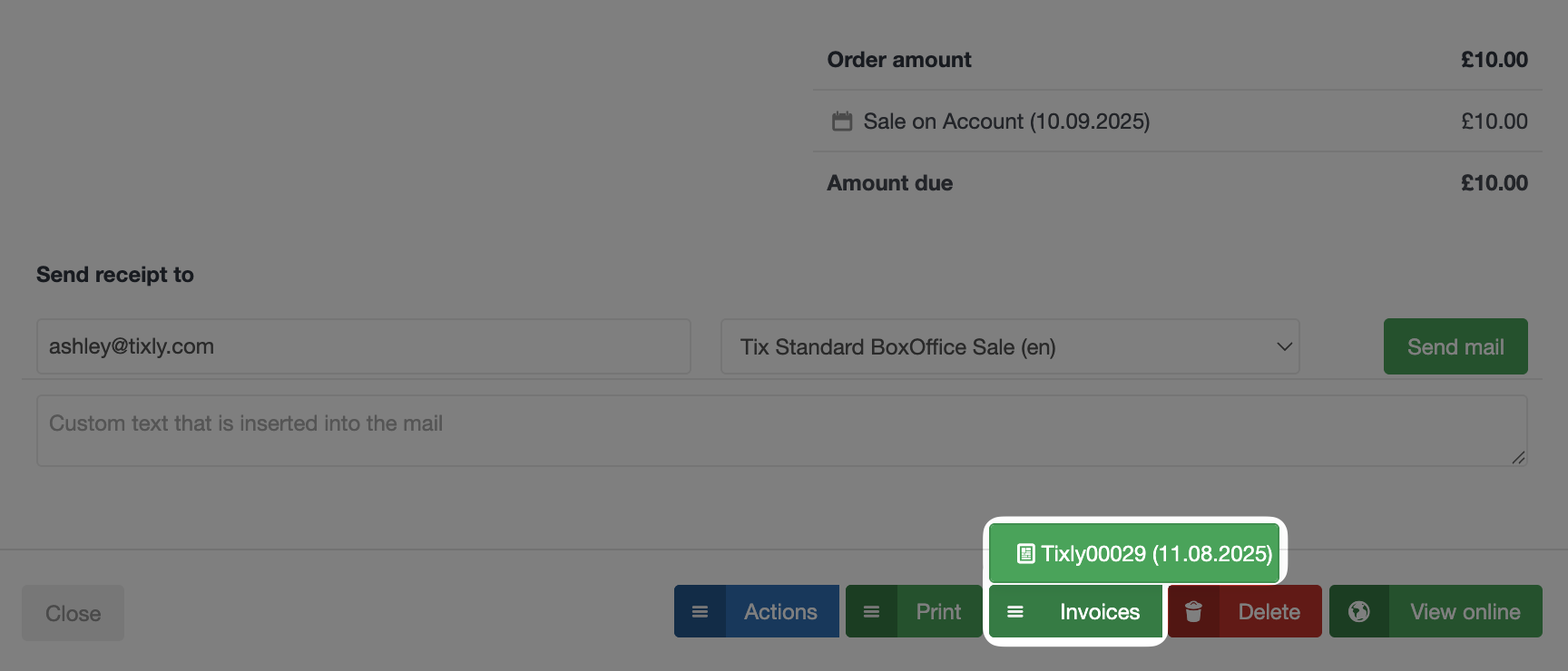- Invoice is intended for use when invoice documents are issued and tracked outside of the Tixly system. Once an order is placed, tickets become available for immediate download via the online receipt page. Invoiced orders can be merged right away, and seat changes can be made without waiting for payment.