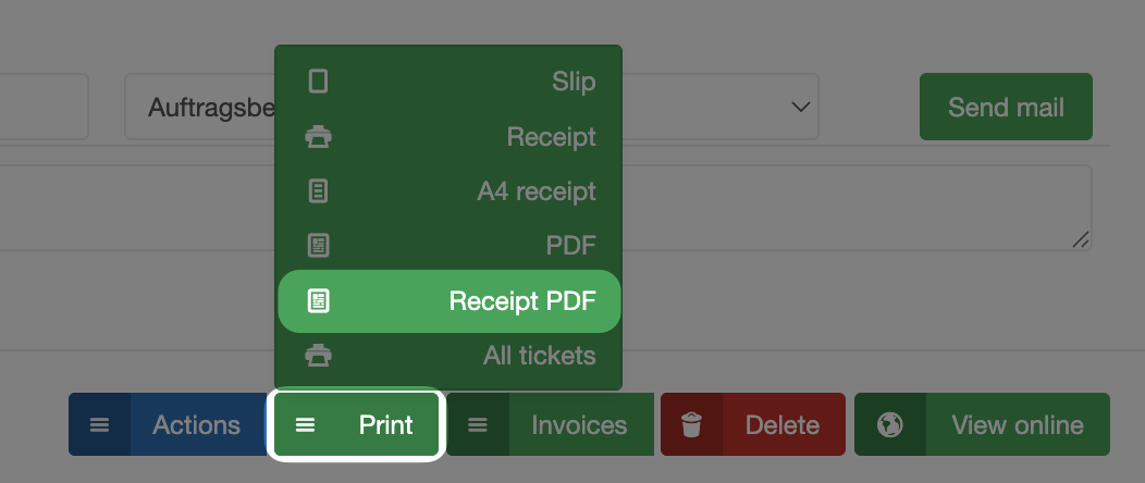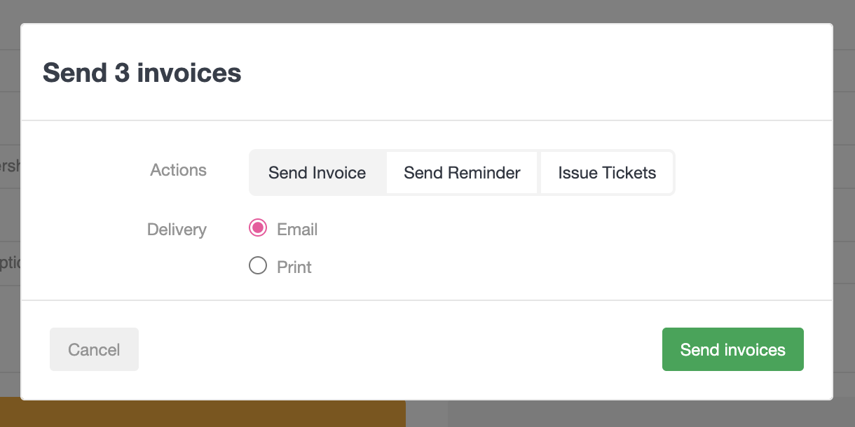 Sale on Account invoices can be managed individually through the Actions button, or in bulk by selecting the checkbox in front of each order and using the Bulk Edit button. Invoices can be sent, reminders can be sent, or tickets can be issued, either by email or as printed copies.