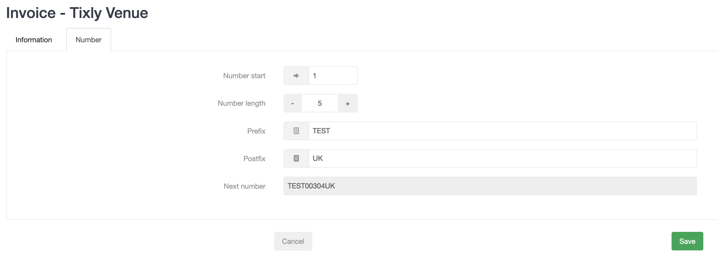 Under the Number tab the invoice numbering can be configured. With a pre- or postfix option to differentiate between the organisations.