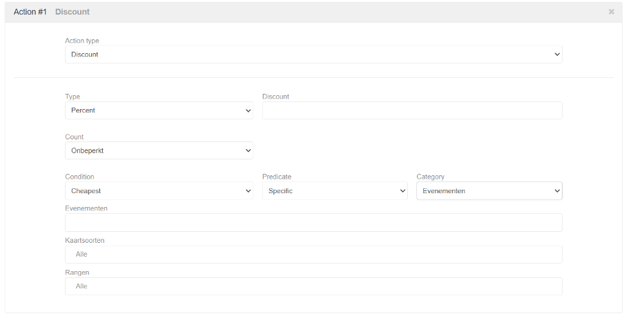 Voorbeeld: [Cheapest + All + Tickets], betekent dat de korting moet worden toegepast op de goedkoopste tickets van alle tickets in de winkelmand.