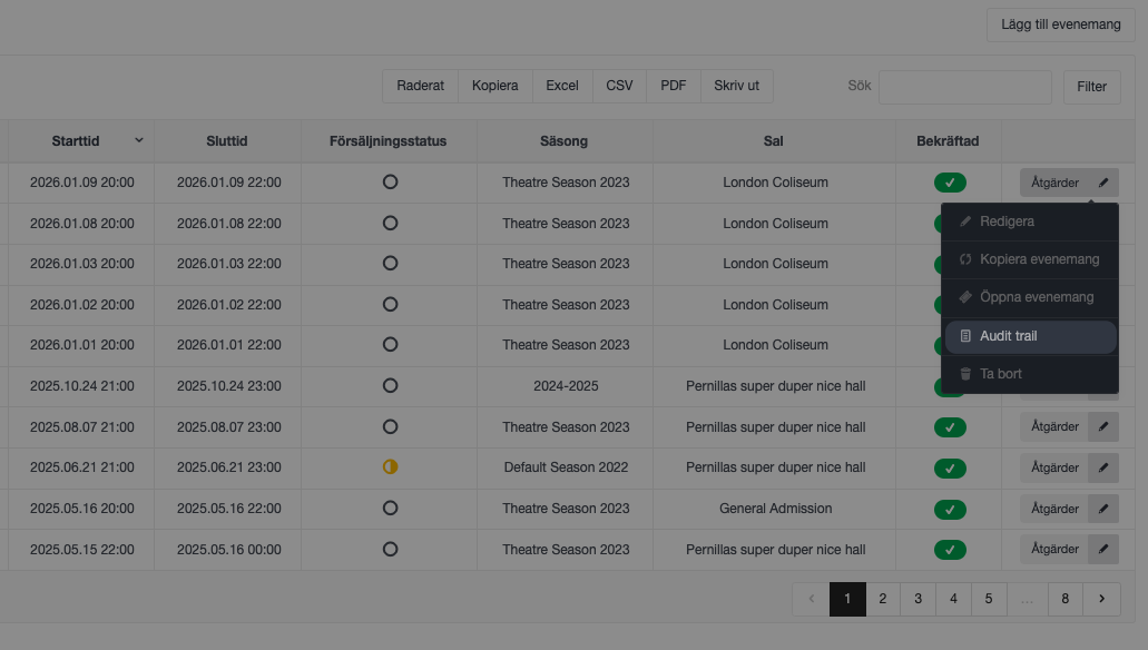 För att öppna Audit Trail, navigera till Administration > Evenemang > Evenemang. Hitta det önskade evenemanget, klicka på Åtgärder och välj Audit Trail.